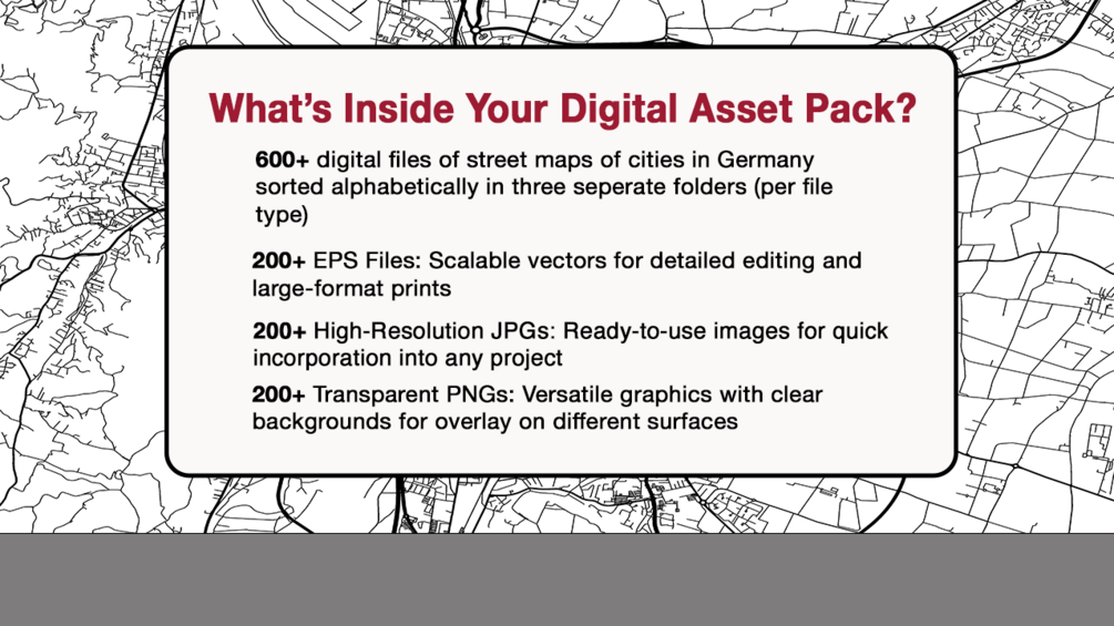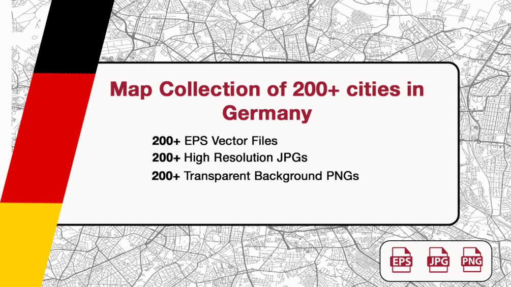 Explore our extensive collection of over 200+ high-resolution maps of German cities, available in PNG, EPS, and JPG formats. Ideal for detailed work in Adobe Illustrator and Photoshop, each map boasts a clarity-enhancing 6000x4000 pixel resolution