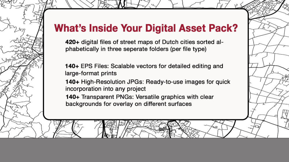 Explore our extensive collection of over 140+ high-resolution maps of Dutch cities, available in PNG, EPS, and JPG formats. Ideal for detailed work in Adobe Illustrator and Photoshop, each map boasts a clarity-enhancing 6000x4000 pixel resolution